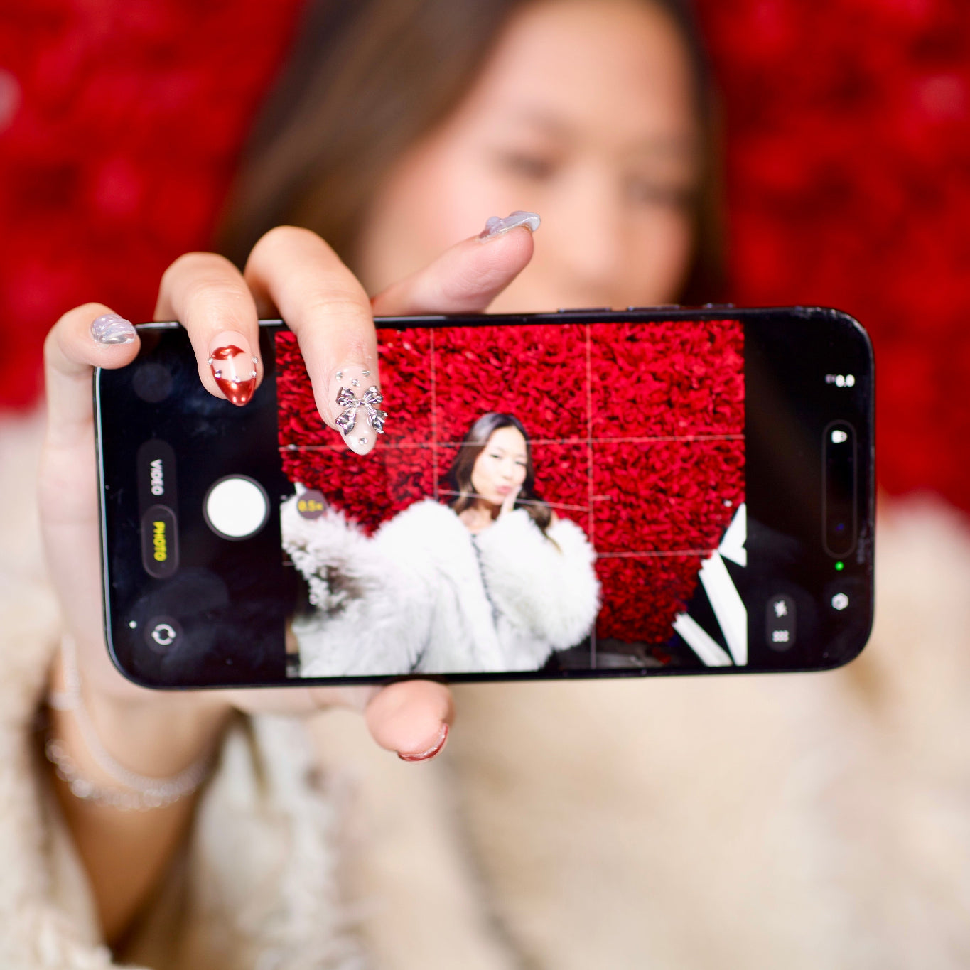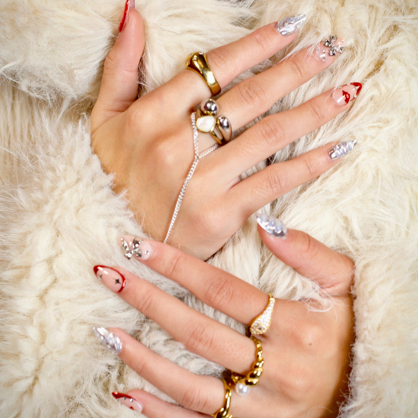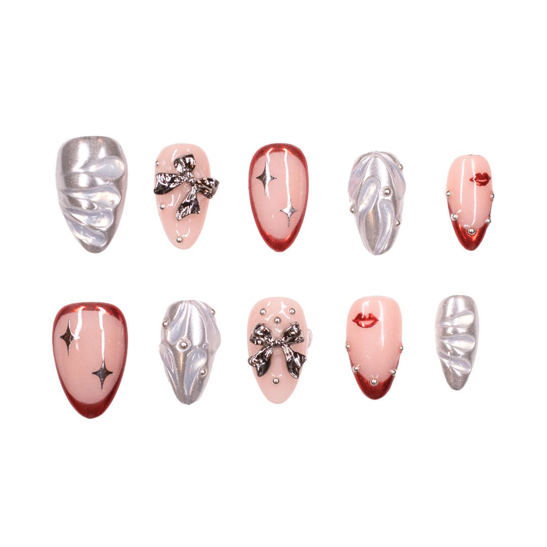 The Carm set is a cool silver chrome base gives the nails an icy shine, while hand-placed bow details add the perfect touch of flirt and femininity. The pops of metallic red bring in a luxe, modern twist that feels equal parts coquette and couture.